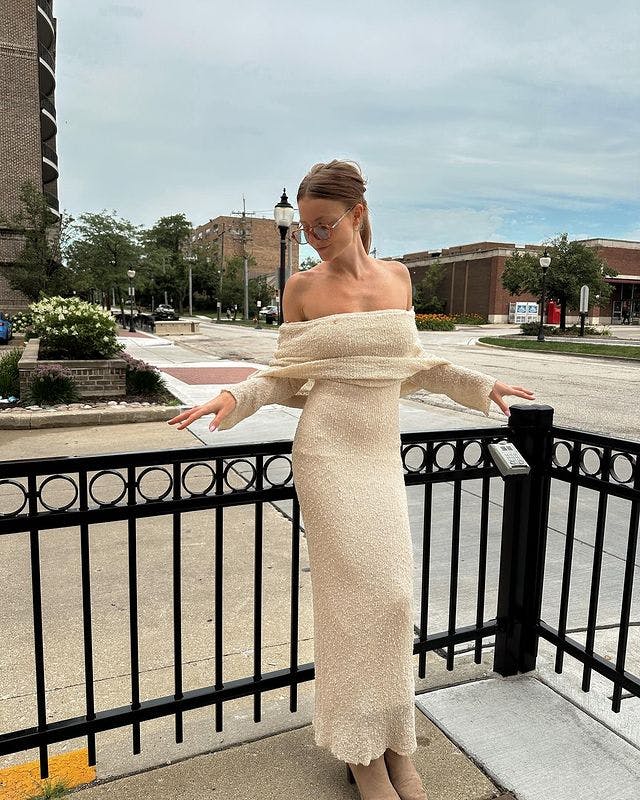 Marisol Ribbed Boucle Material Draped Off Shoulder Stretch Vacation Maxi Dress